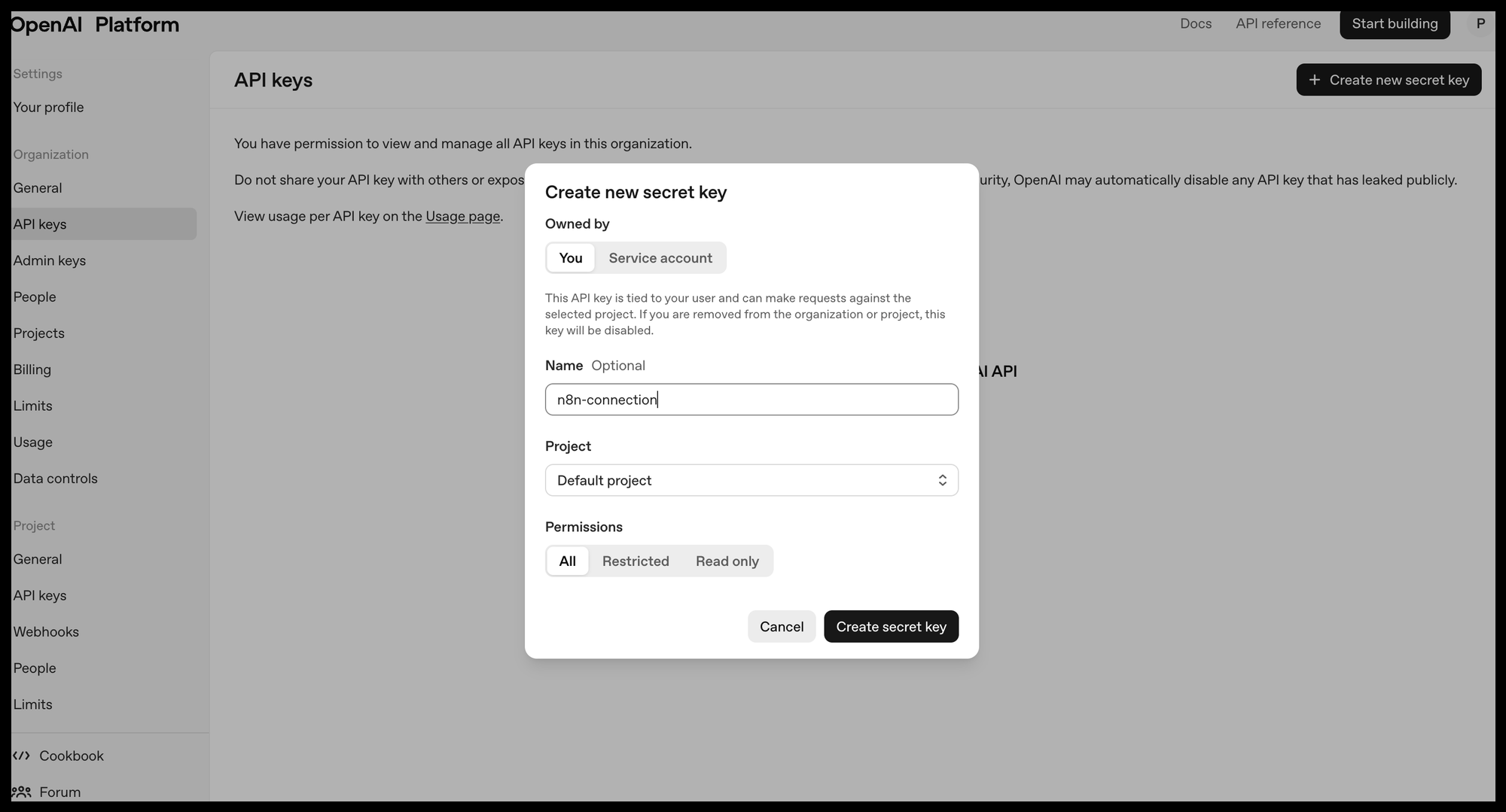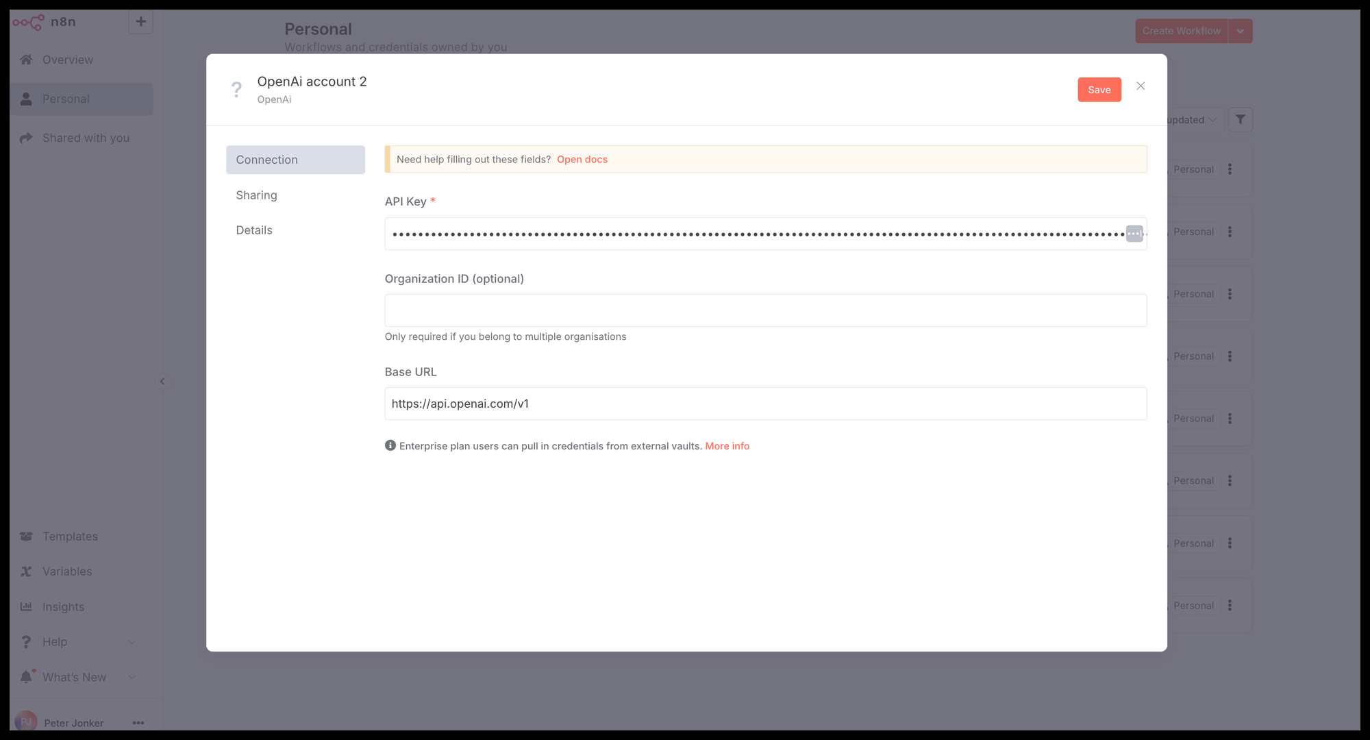 That's it! To confirm it works, open any workflow, add an OpenAI node, and select your newly created credential from the dropdown. If the node executes without errors, you're officially connected.