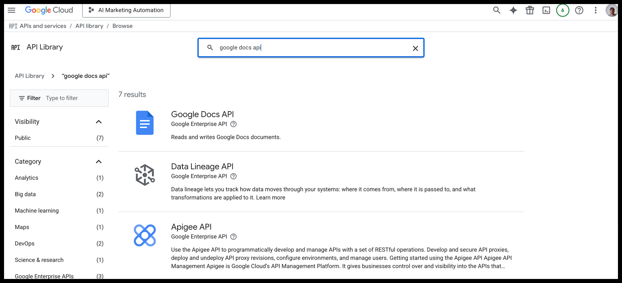 - Search for the service you need, for example, "Google Docs API," and click "Enable."