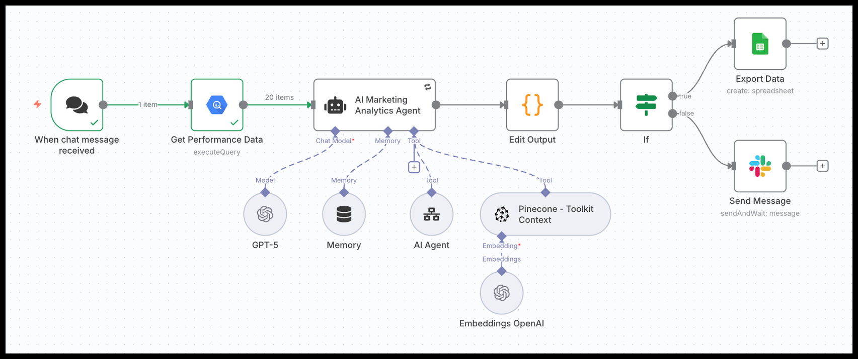 AI Marketing Automation is the use of large language models (LLMs), workflow automation tools like n8n, and data integrations to streamline and automate campaign management, data-activation, analytics and reporting.