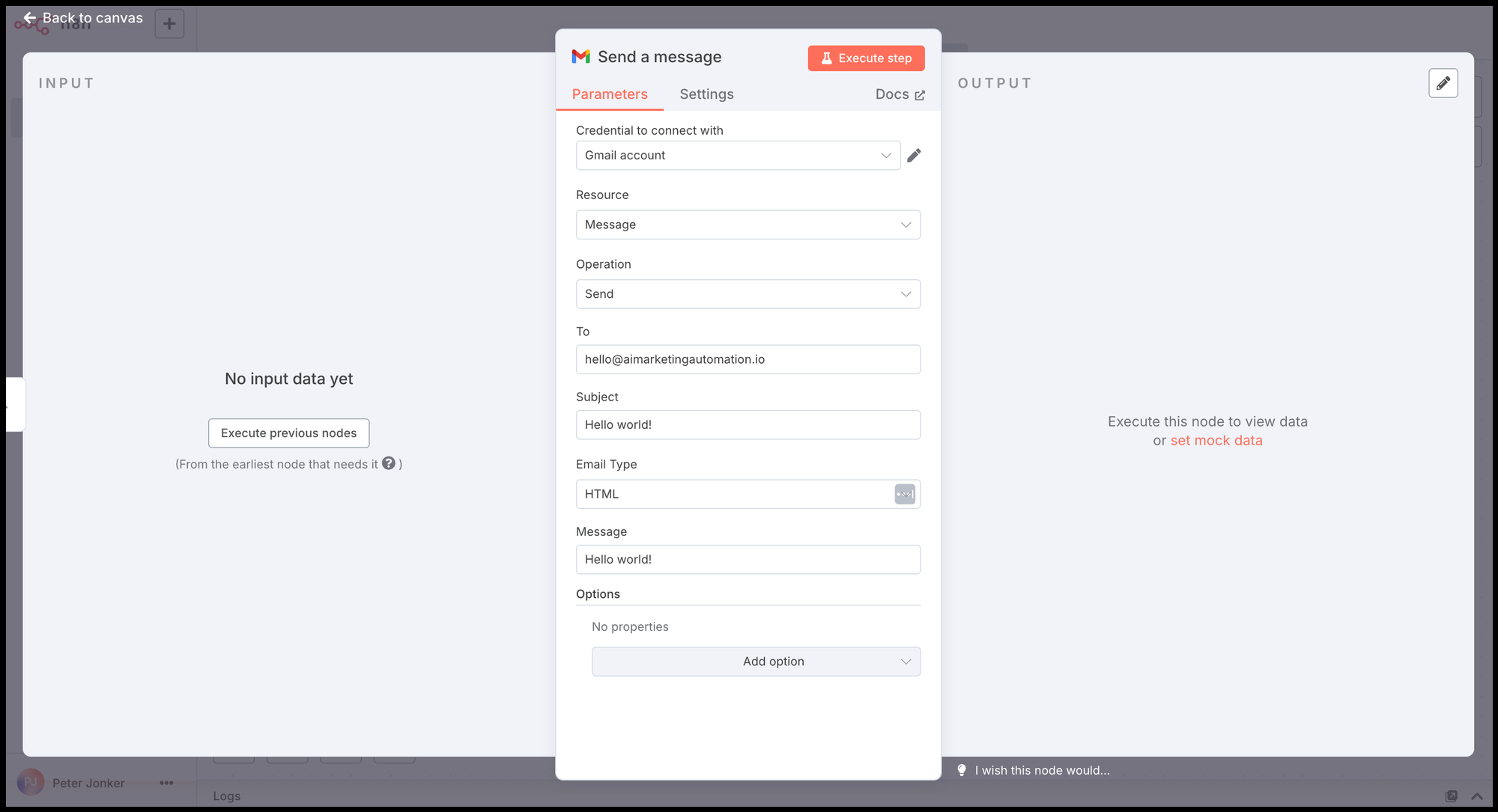 Open the Gmail ‘Send a message’ node by double-clicking it. In the settings, add your credentials and fill in the email fields. This example is straightforward, as shown in the setup below.