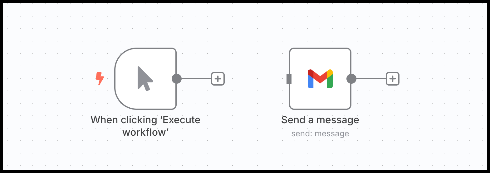 For our Gmail send email workflow, we will add the native 'Send a message' node from Gmail to our workflow by searching for it in the node section. Now your workflow should look like this: